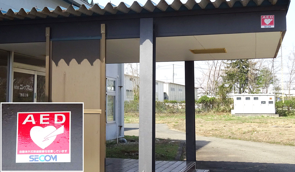 安全配慮の一環としてAED(自動体外式除細動器)を設置し、使用法の社内講習を行いいざというとき即時に使用できるようにしています。