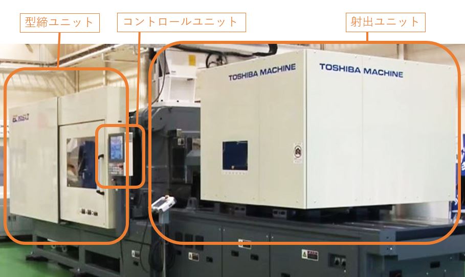 インジェクション成形機は、大きく分けて「射出ユニット」、「型締ユニット」、「コントロールユニット」の3つで構成されています。