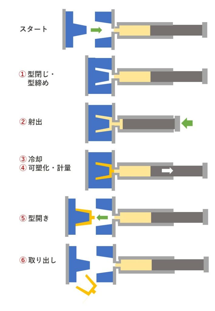 インジェクション成形の工程は、次のステップに分かれます。